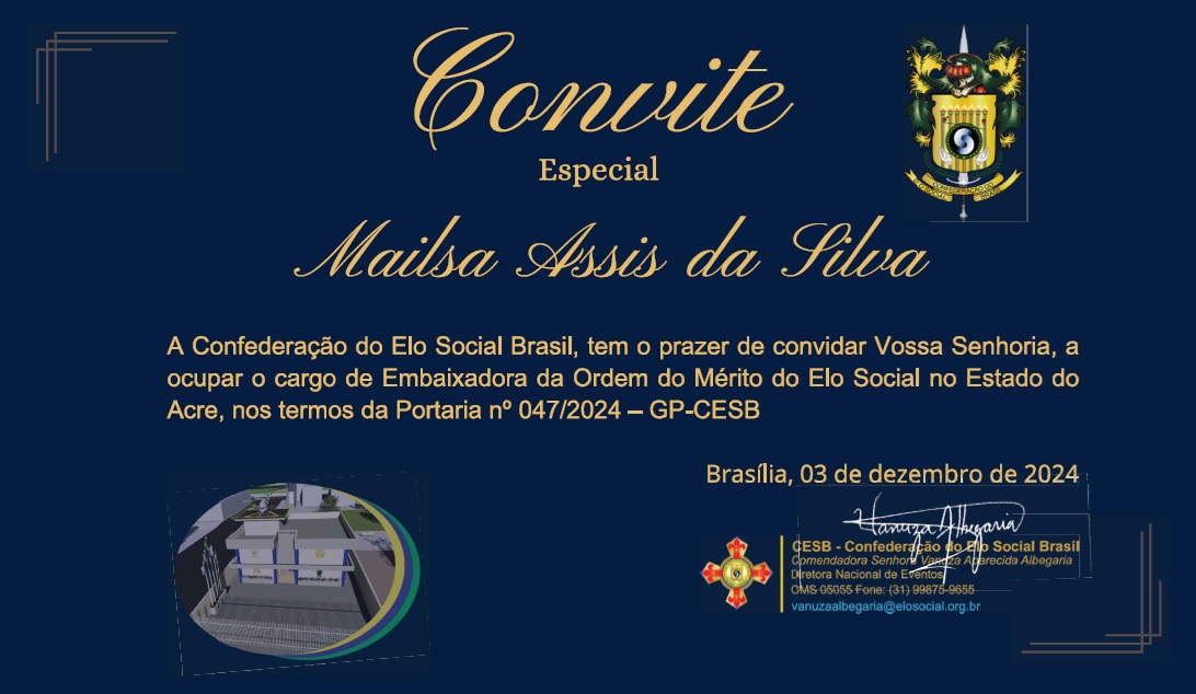 A Vice-Governadora do Estado do Acre, Mailza Assis da Silva, acumulando o cargo de Primeira-dama é notificada e convidada através do Oficio nº 321/2024 - GP-CESB, a ocupar o cargo de Embaixadora da Ordem do Mérito do Elo Social, no Estado do Acre. (cerimonial)